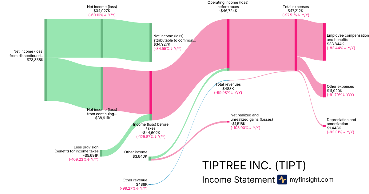 For the year ending 2025-12-31, TIPT made $488K in revenue. $34,927K in net income. Net profit margin of 7157.17%.