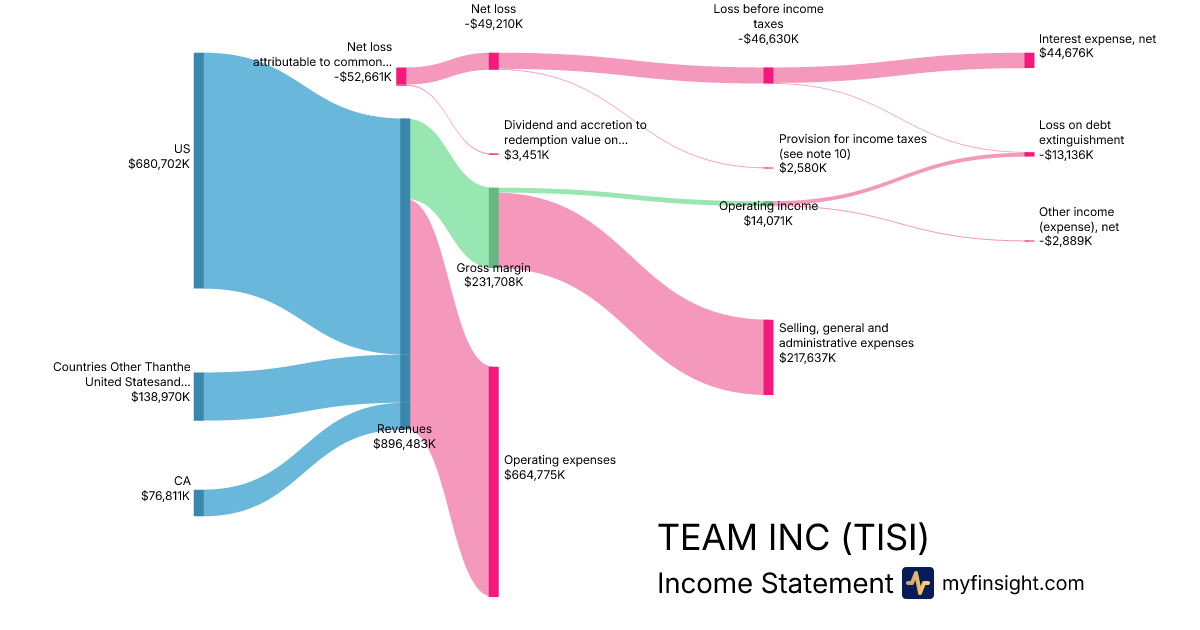 For the year ending 2025-12-31, TISI made $896,483K in revenue. -$52,661K in net income. Net profit margin of -5.87%.