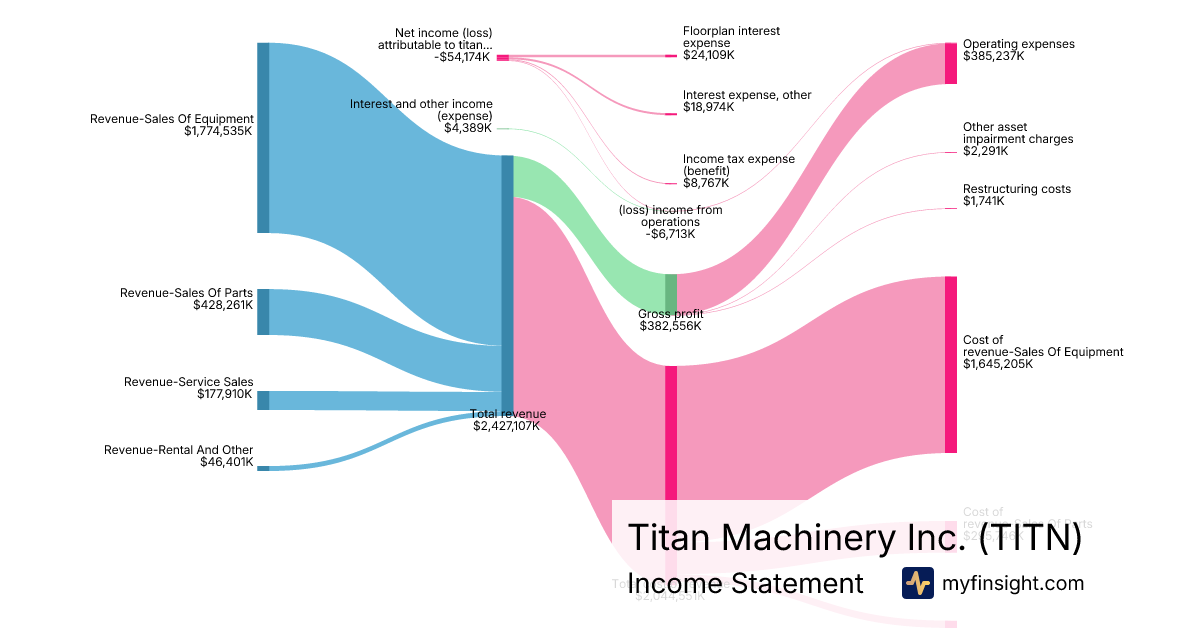 For the year ending 2026-01-31, TITN made $2,427,107K in revenue. -$54,174K in net income. Net profit margin of -2.23%.