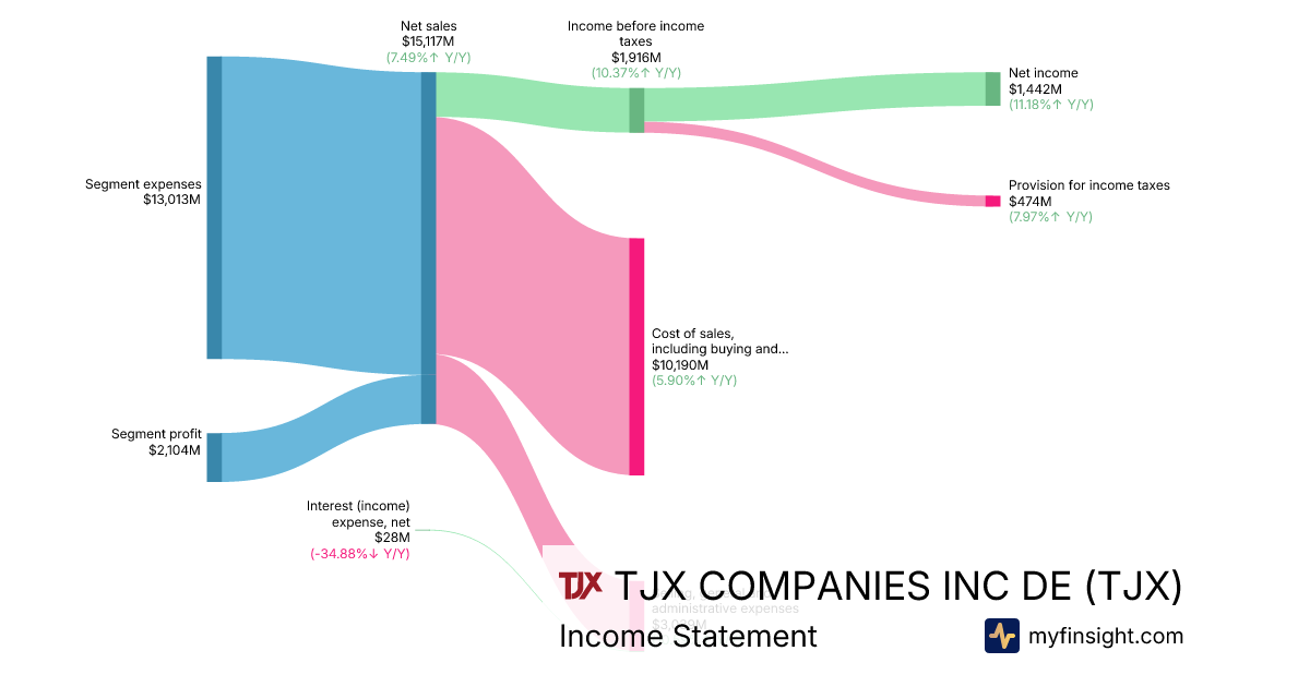 For the quarter ending 2025-11-01, TJX made $15,117M in revenue. $1,442M in net income. Net profit margin of 9.54%.