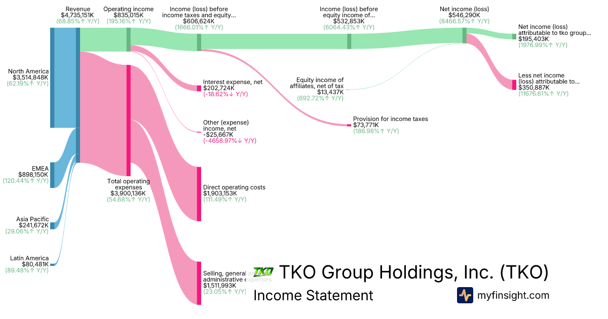 For the year ending 2025-12-31, TKO made $4,735,151K in revenue. $195,403K in net income. Net profit margin of 4.13%.