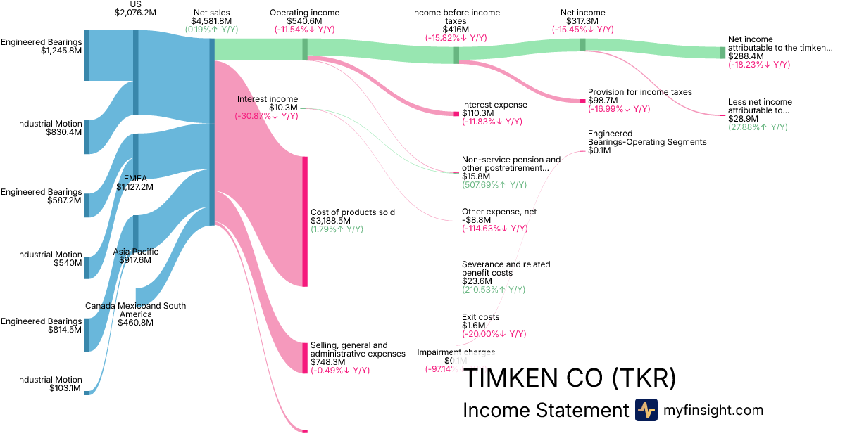 For the year ending 2025-12-31, TKR made $4,581.8M in revenue. $288.4M in net income. Net profit margin of 6.29%.