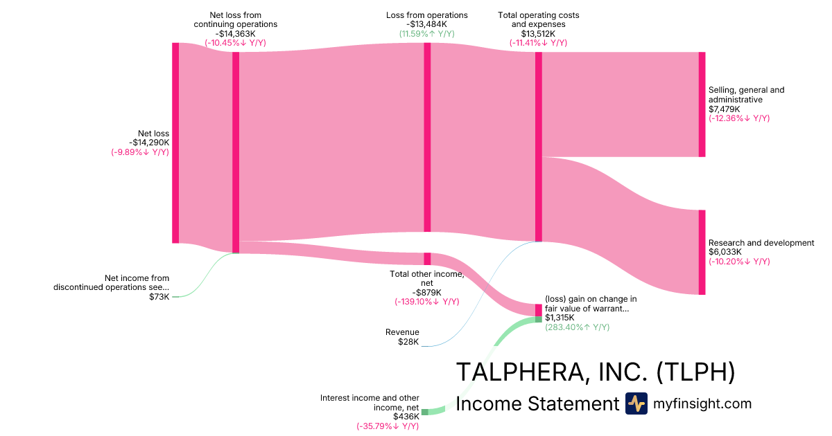 For the year ending 2025-12-31, TLPH made $28K in revenue. -$14,290K in net income. Net profit margin of -51035.71%.
