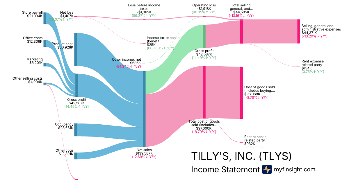 For the quarter ending 2025-11-01, TLYS made $139,587K in revenue. -$1,407K in net income. Net profit margin of -1.01%.