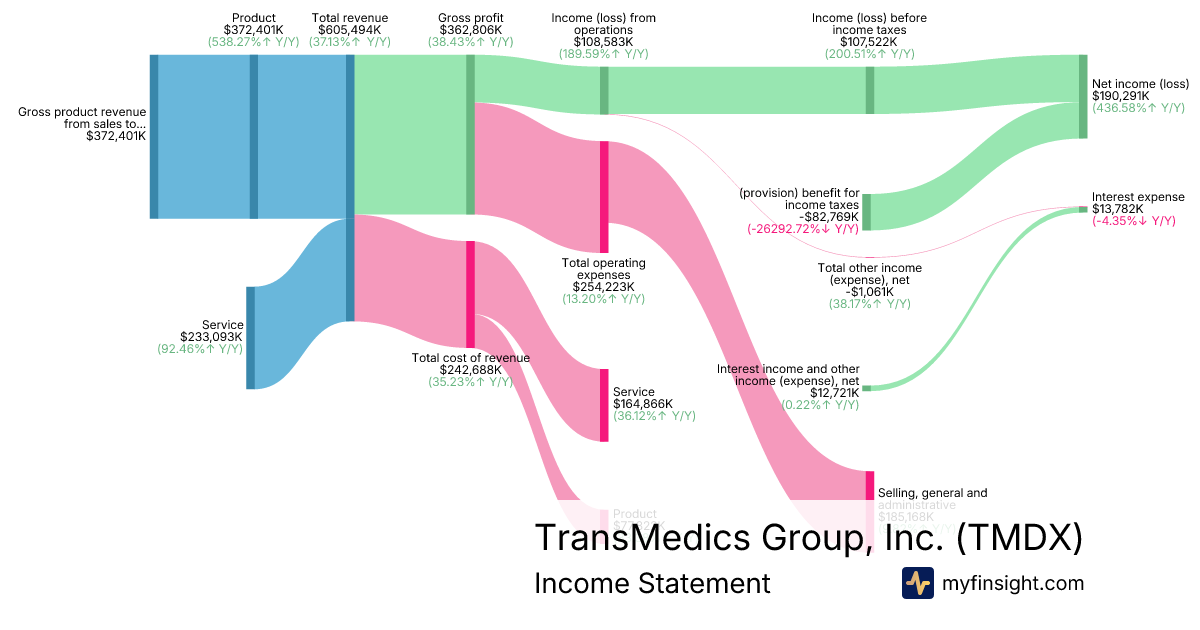 For the year ending 2025-12-31, TMDX made $605,494K in revenue. $190,291K in net income. Net profit margin of 31.43%.