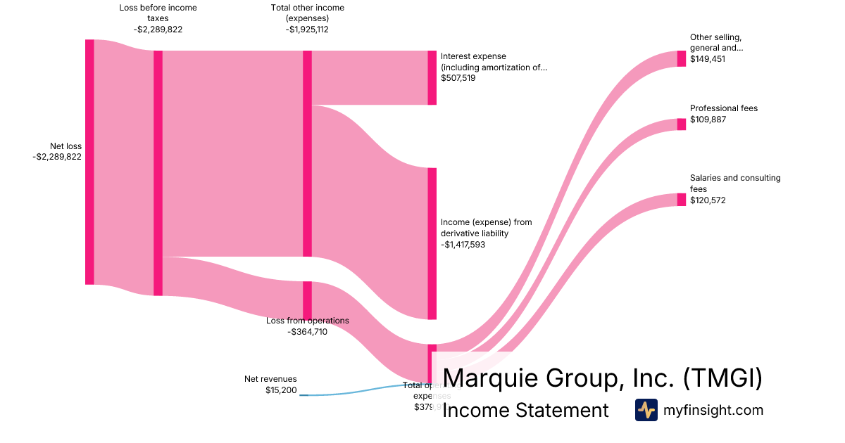 For the quarter ending 2025-11-30, TMGI made $15,200 in revenue. -$2,289,822 in net income. Net profit margin of -15064.62%.