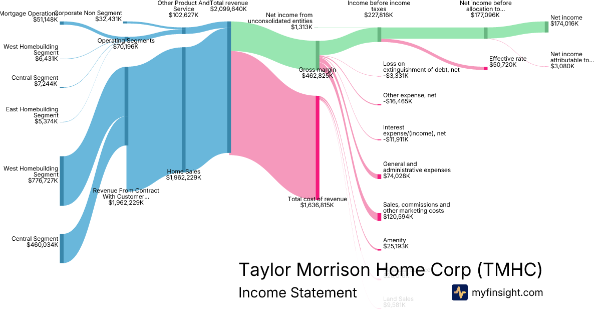 For the year ending 2025-12-31, TMHC made $8,121,480K in revenue. $782,500K in net income. Net profit margin of 9.63%.