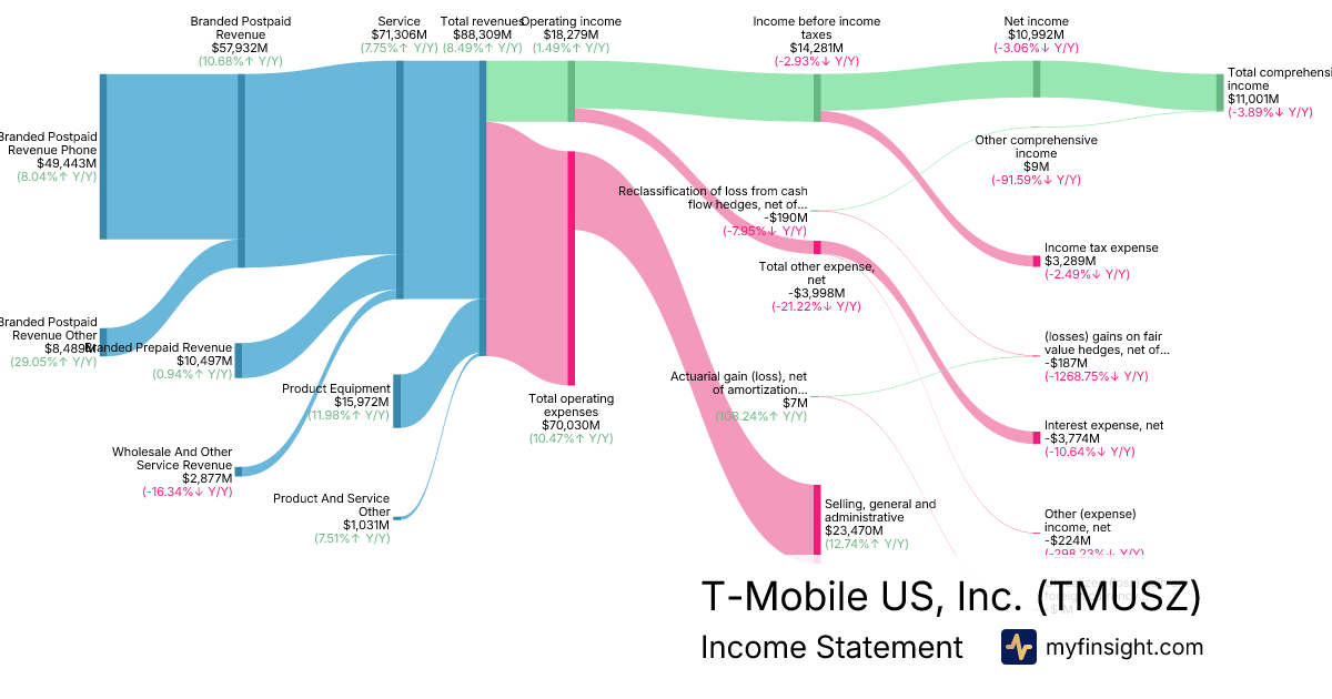 For the year ending 2025-12-31, TMUSZ made $88,309M in revenue. $11,001M in net income. Net profit margin of 12.46%.