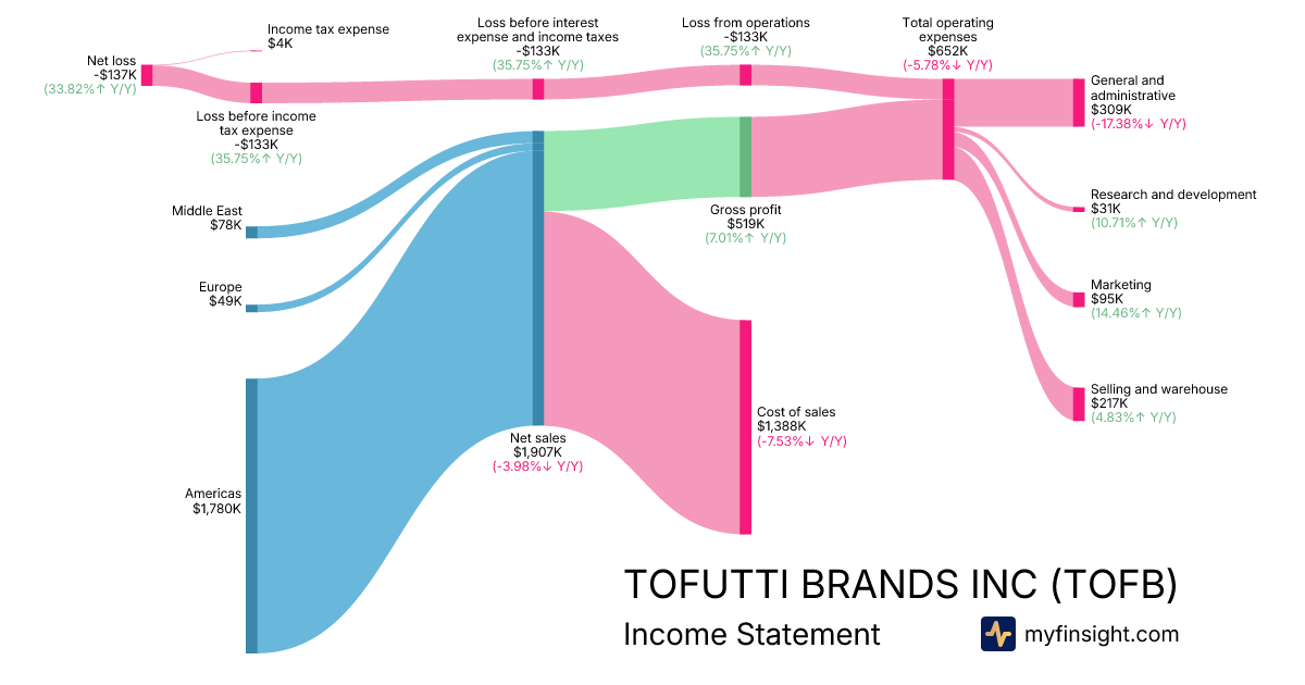 For the quarter ending 2025-09-27, TOFB made $1,907K in revenue. -$137K in net income. Net profit margin of -7.18%.