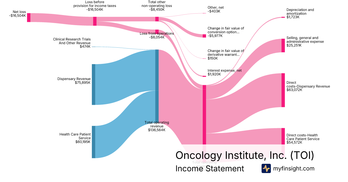 For the quarter ending 2025-09-30, TOI made $136,564K in revenue. -$16,504K in net income. Net profit margin of -12.09%.
