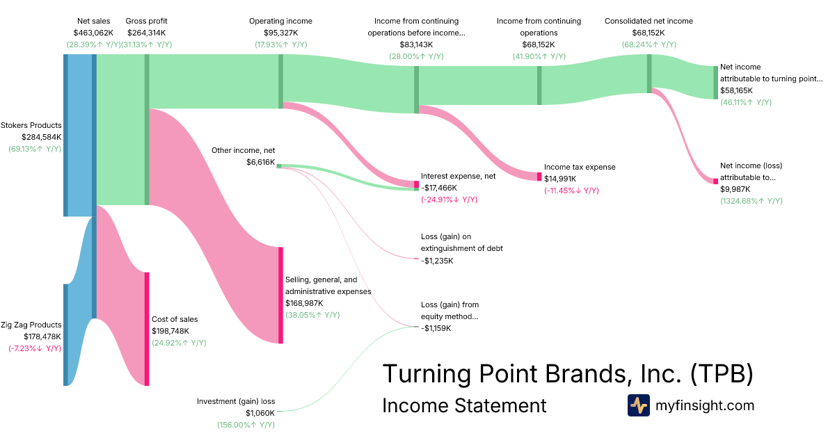 For the year ending 2025-12-31, TPB made $463,062K in revenue. $58,165K in net income. Net profit margin of 12.56%.