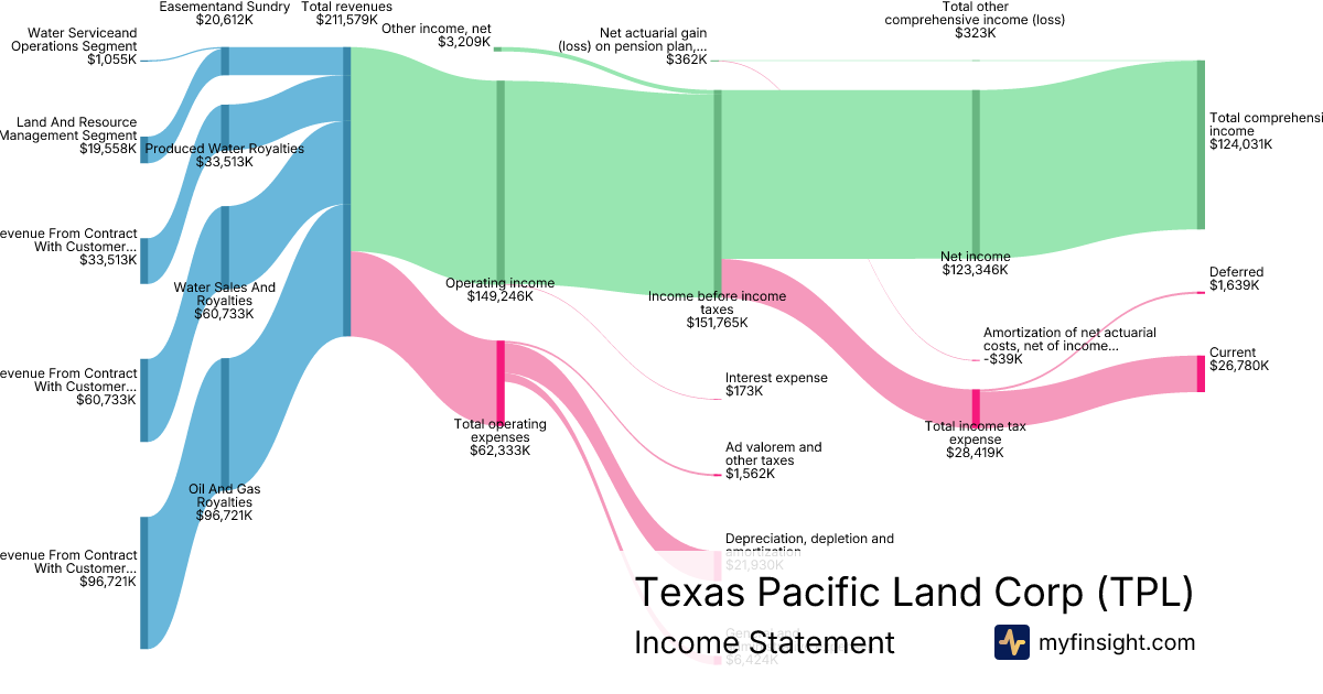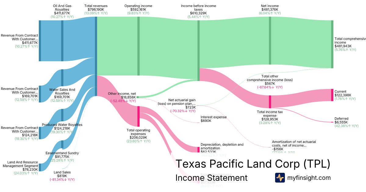 For the year ending 2025-12-31, TPL made $798,190K in revenue. $481,943K in net income. Net profit margin of 60.38%.