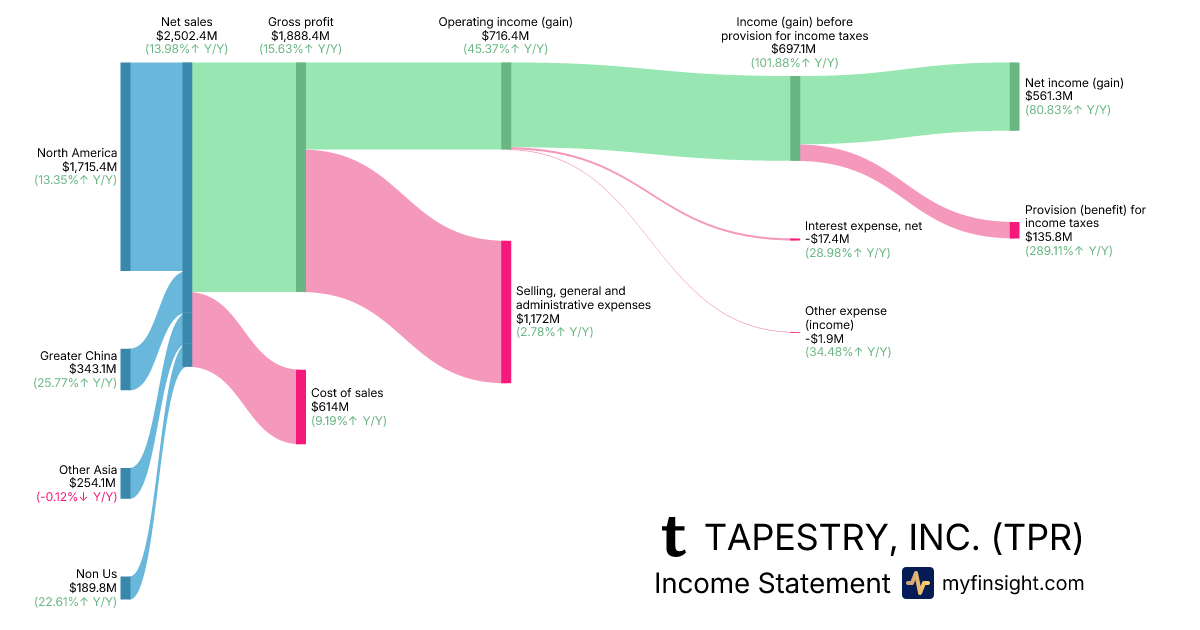 For the quarter ending 2025-12-27, TPR made $2,502.4M in revenue. $561.3M in net income. Net profit margin of 22.43%.