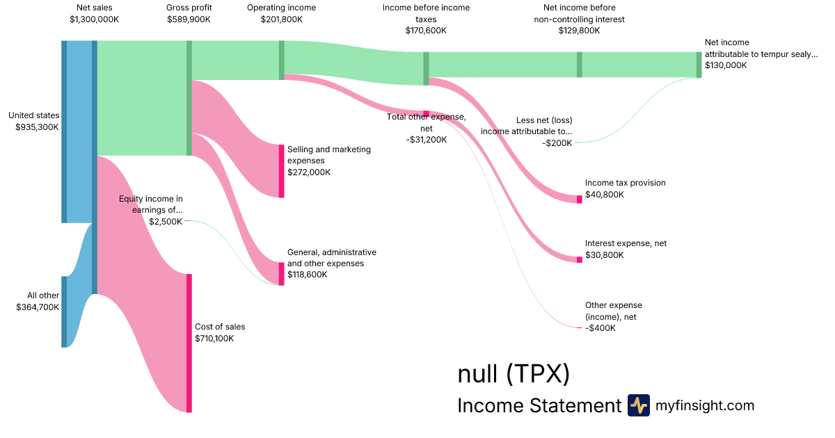 For the quarter ending 2024-09-30, TPX made $1,300,000K in revenue. $130,000K in net income. Net profit margin of 10.00%.