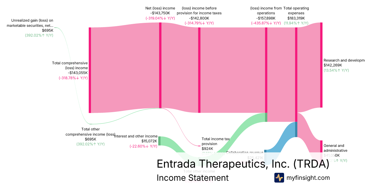 For the year ending 2025-12-31, TRDA made $25,421K in revenue. -$143,055K in net income. Net profit margin of -562.74%.