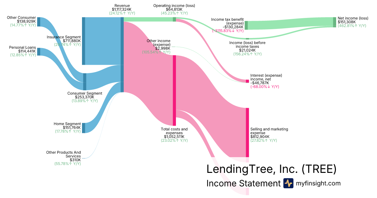 For the year ending 2025-12-31, TREE made $1,117,324K in revenue. $151,308K in net income. Net profit margin of 13.54%.