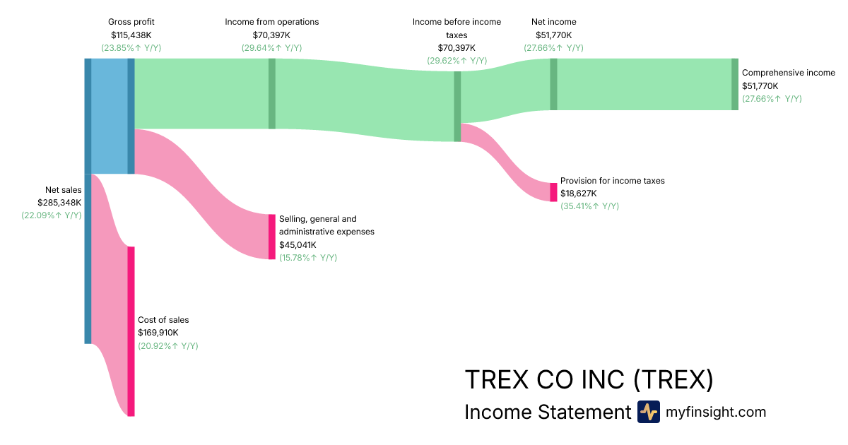 For the quarter ending 2025-09-30, TREX made $285,348,000 in revenue. $51,770,000 in net income. Net profit margin of 18.14%.