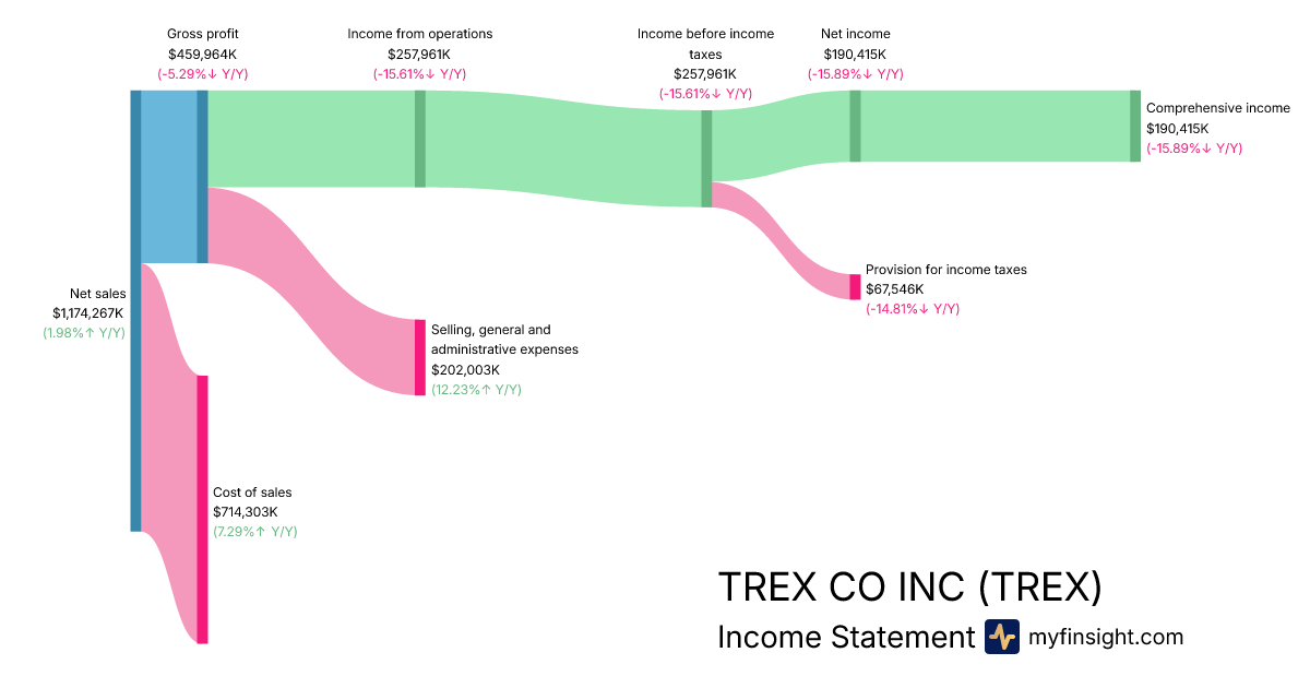 For the year ending 2025-12-31, TREX made $1,174,267K in revenue. $190,415K in net income. Net profit margin of 16.22%.