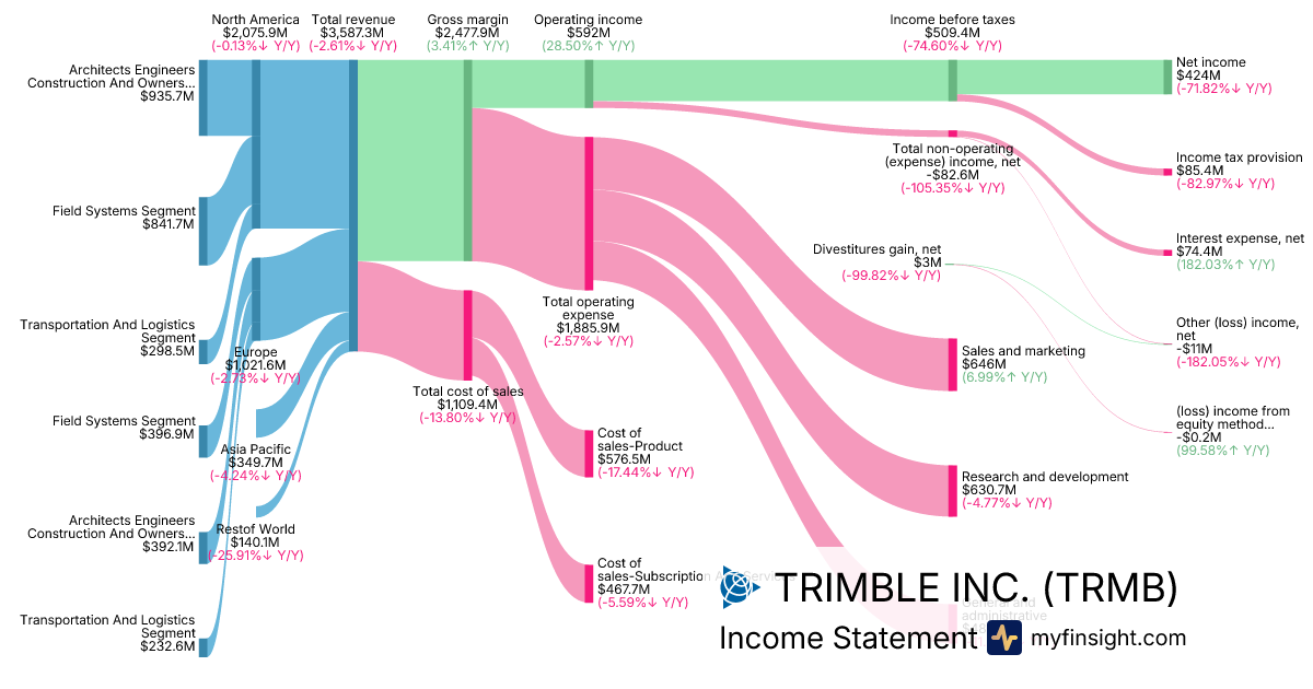For the year ending 2026-01-02, TRMB made $3,587.3M in revenue. $424M in net income. Net profit margin of 11.82%.