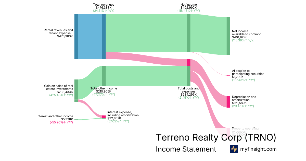 For the year ending 2025-12-31, TRNO made $476,383K in revenue. $401,193K in net income. Net profit margin of 84.22%.