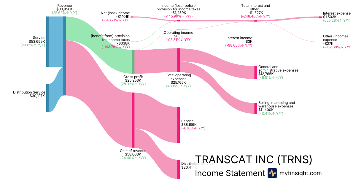 For the quarter ending 2025-12-27, TRNS made $83,856K in revenue. -$1,101K in net income. Net profit margin of -1.31%.