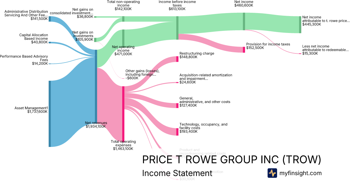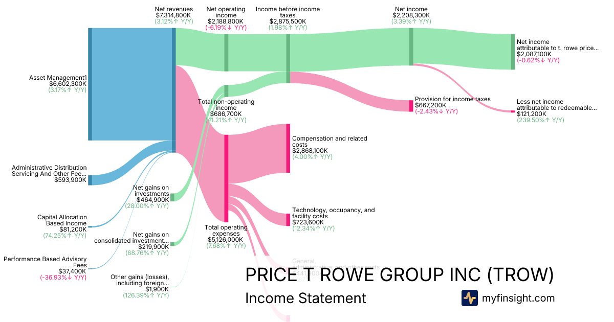 For the year ending 2025-12-31, TROW made $7,314,800K in revenue. $2,087,100K in net income. Net profit margin of 28.53%.