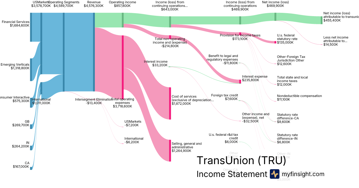 For the year ending 2025-12-31, TRU made $4,576,300K in revenue. $455,400K in net income. Net profit margin of 9.95%.