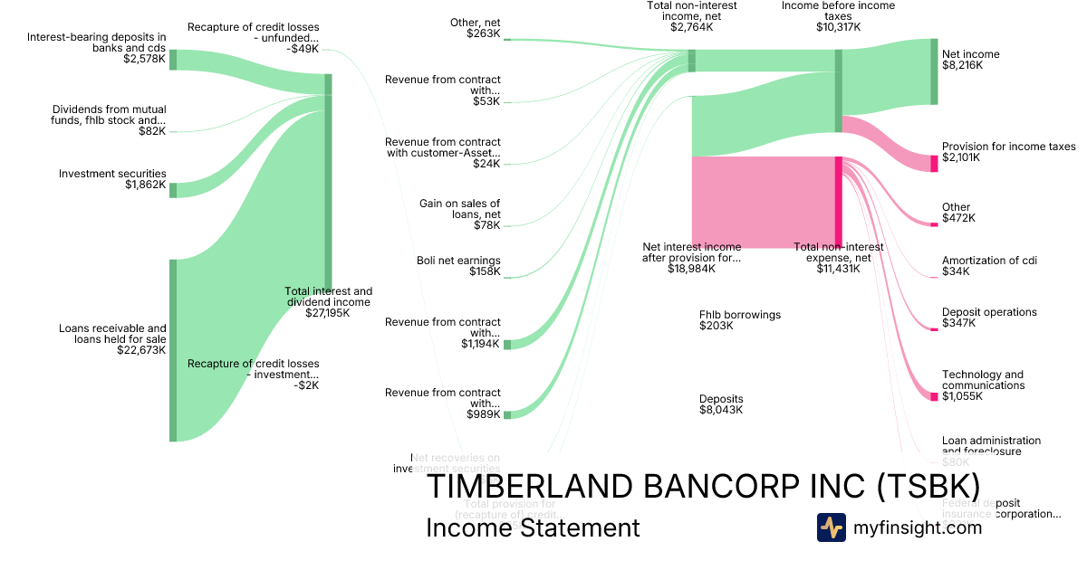 For the quarter ending 2025-12-31, TSBK made $49,642K in revenue. $8,216K in net income. Net profit margin of 16.55%.