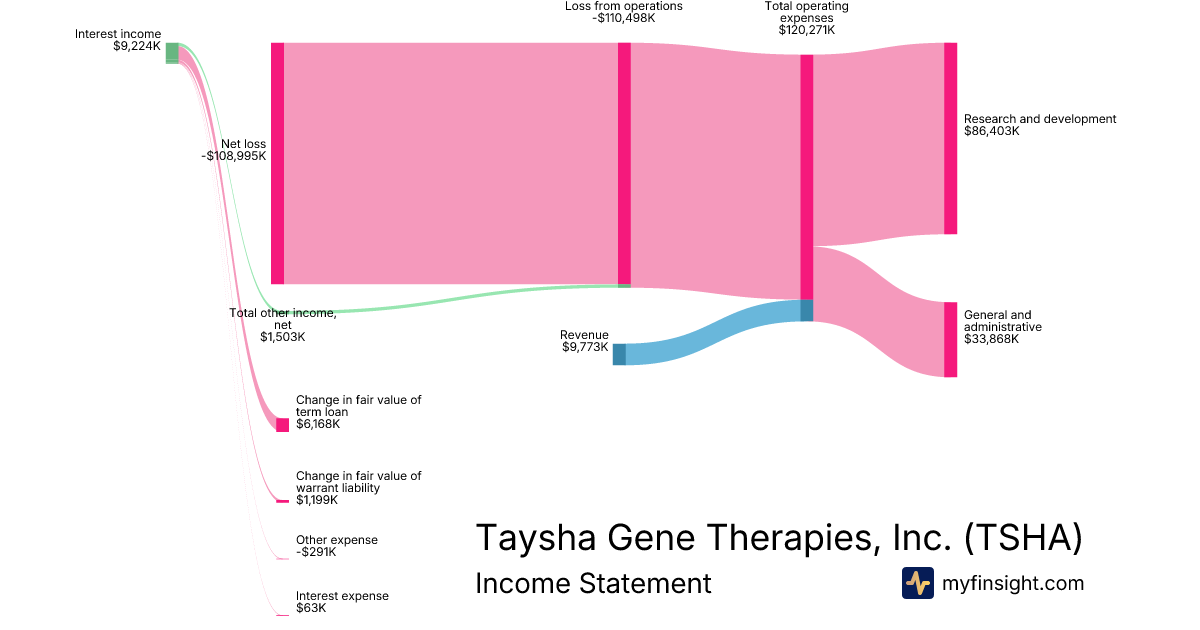 For the year ending 2025-12-31, TSHA made $9,773K in revenue. -$108,995K in net income. Net profit margin of -1115.27%.