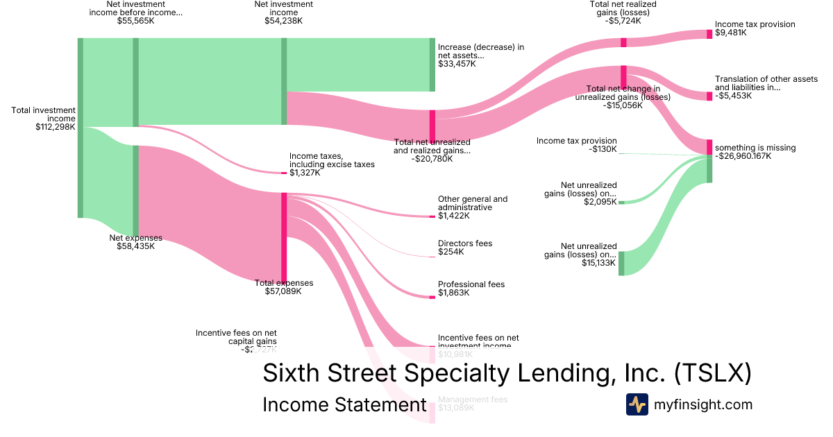 For the year ending 2025-12-31, TSLX made $733,415K in revenue. $170,517K in net income. Net profit margin of 23.25%.