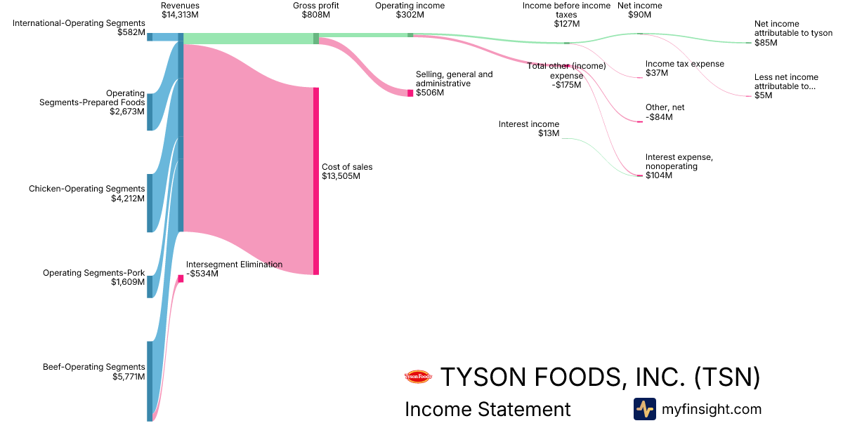 For the quarter ending 2025-12-27, TSN made $14,313M in revenue. $85M in net income. Net profit margin of 0.59%.