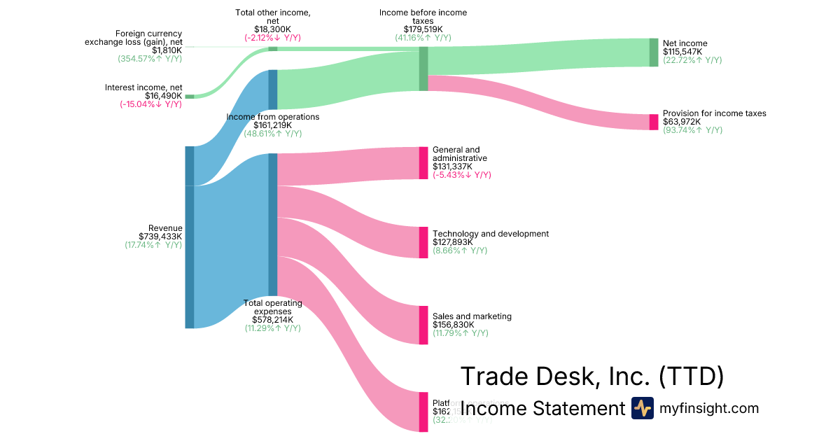 For the quarter ending 2025-09-30, TTD made $739,433K in revenue. $115,547K in net income. Net profit margin of 15.63%.