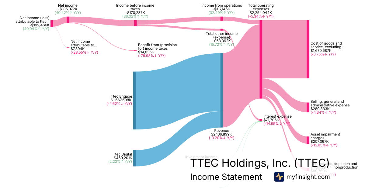 For the year ending 2025-12-31, TTEC made $2,136,899K in revenue. -$192,466K in net income. Net profit margin of -9.01%.