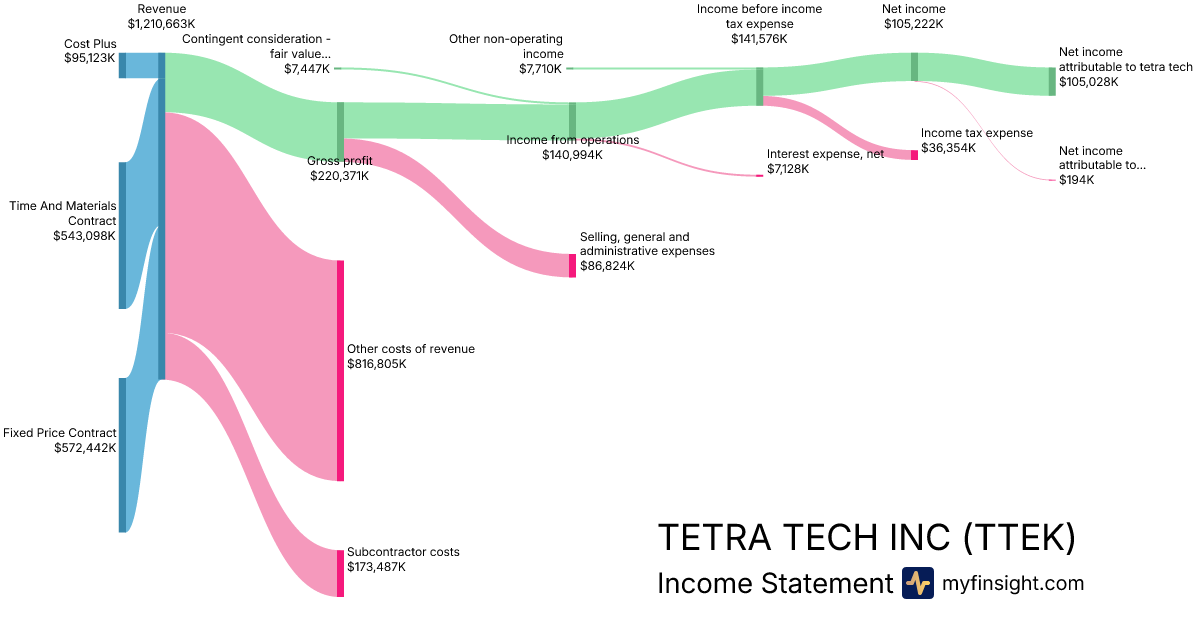 For the quarter ending 2025-12-28, TTEK made $1,210,663K in revenue. $105,028K in net income. Net profit margin of 8.68%.
