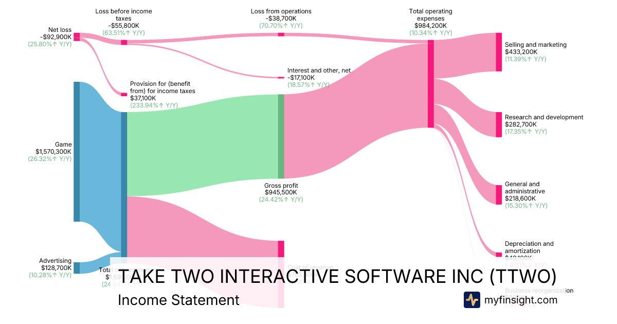 For the quarter ending 2025-12-31, TTWO made $1,699,000K in revenue. -$92,900K in net income. Net profit margin of -5.47%.
