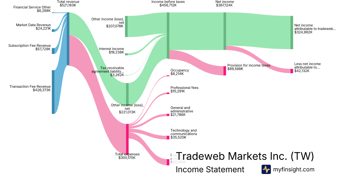 For the year ending 2025-12-31, TW made $2,052,429K in revenue. $812,792K in net income. Net profit margin of 39.60%.