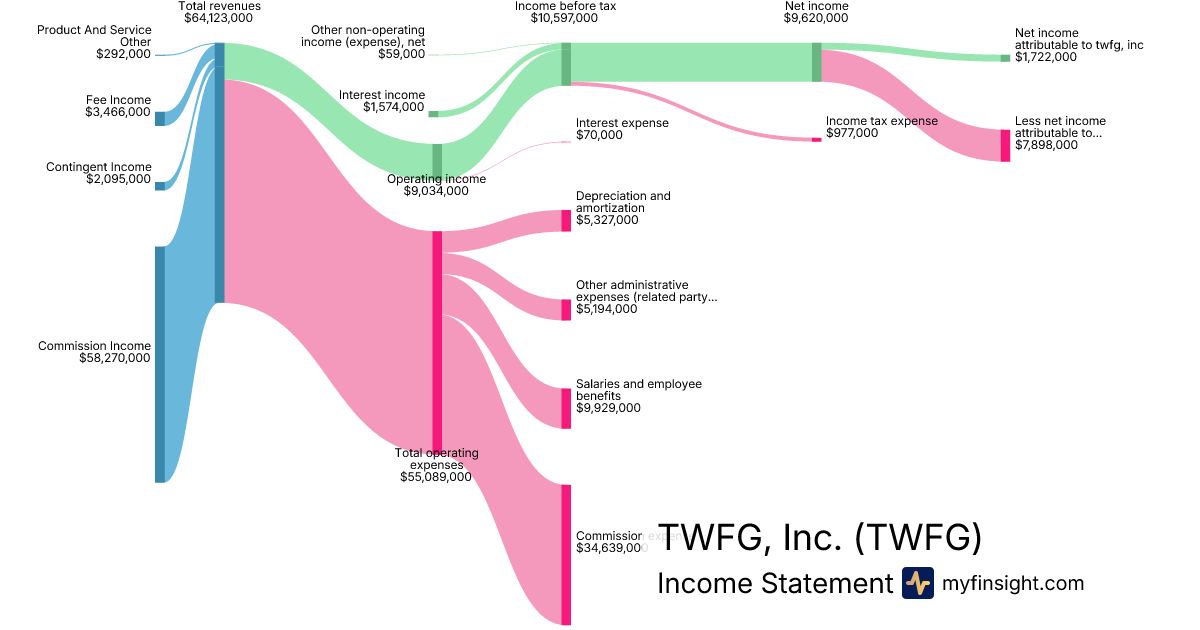 For the quarter ending 2025-09-30, TWFG made $64,123,000 in revenue. $1,722,000 in net income. Net profit margin of 2.69%.
