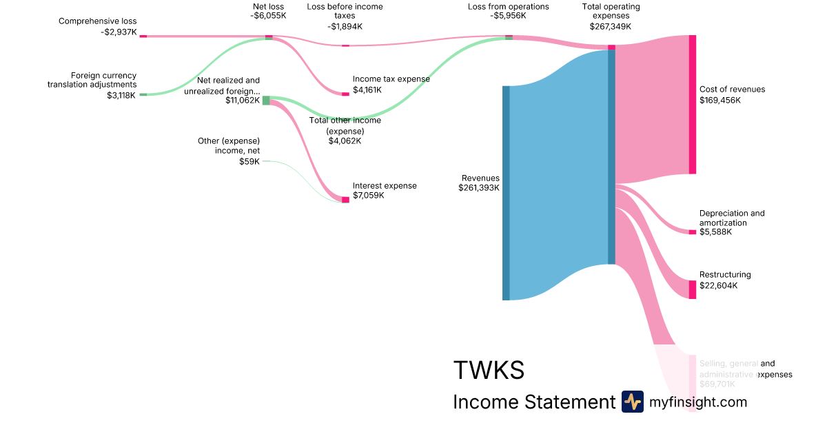 For the quarter ending 2024-09-30, TWKS made $261,393K in revenue. -$2,937K in net income. Net profit margin of -1.12%.