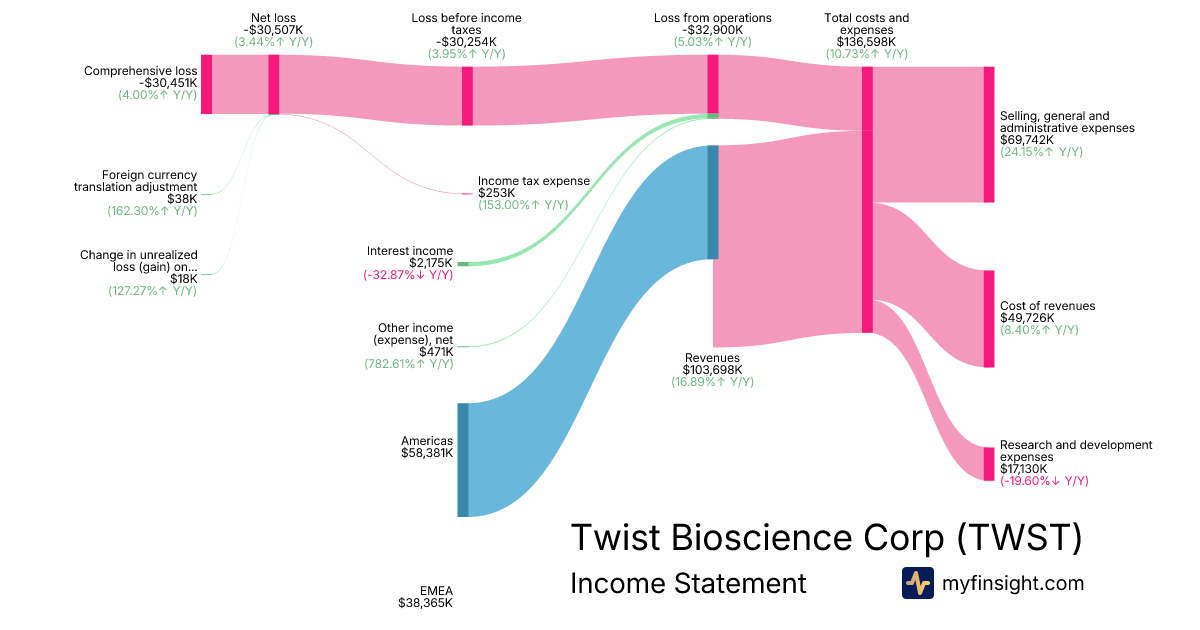 For the quarter ending 2025-12-31, TWST made $103,698K in revenue. -$30,451K in net income. Net profit margin of -29.37%.