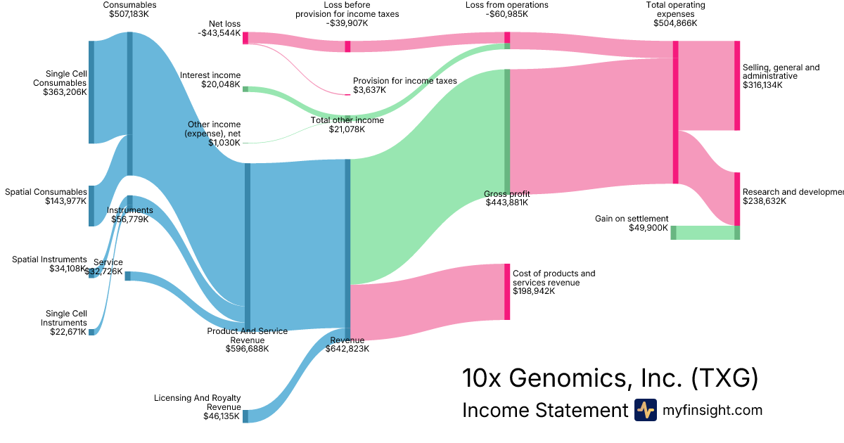 For the year ending 2025-12-31, TXG made $642,823K in revenue. -$43,544K in net income. Net profit margin of -6.77%.