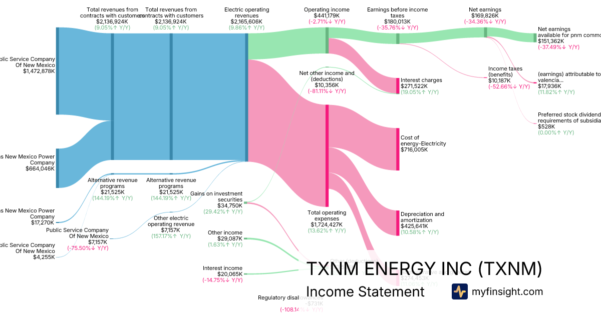 For the year ending 2025-12-31, TXNM made $2,165,606K in revenue. $151,362K in net income. Net profit margin of 6.99%.
