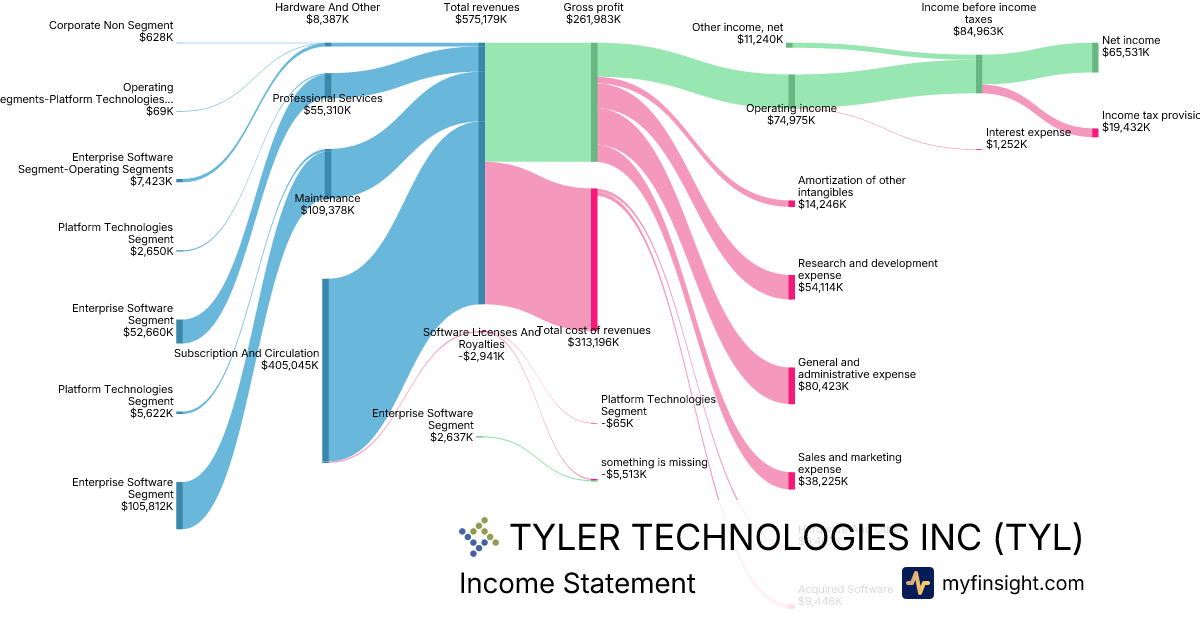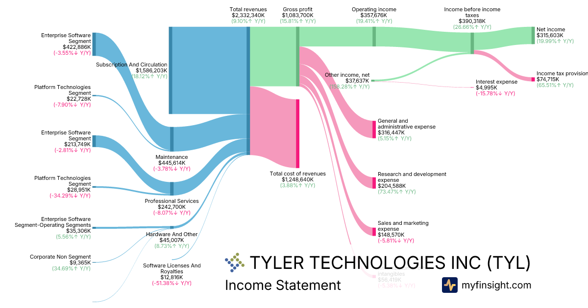 For the year ending 2025-12-31, TYL made $2,332,340K in revenue. $315,603K in net income. Net profit margin of 13.53%.