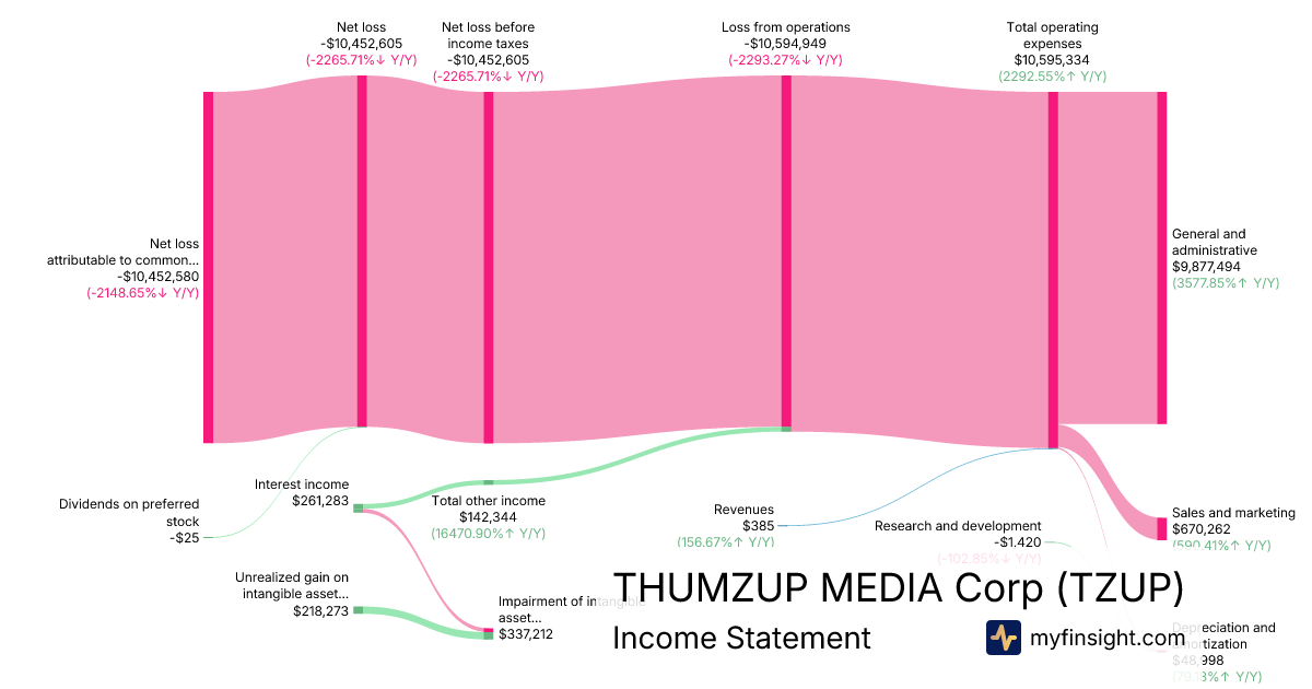 For the quarter ending 2025-09-30, TZUP made $385 in revenue. -$10,452,580 in net income. Net profit margin of -2714955.84%.