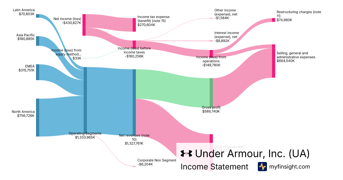 For the quarter ending 2025-12-31, UA made $1,327,761K in revenue. -$430,827K in net income. Net profit margin of -32.45%.