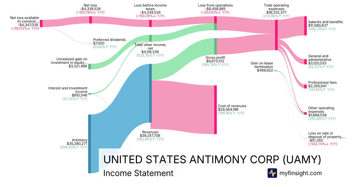 For the year ending 2025-12-31, UAMY made $39,257,708 in revenue. -$4,347,026 in net income. Net profit margin of -11.07%.