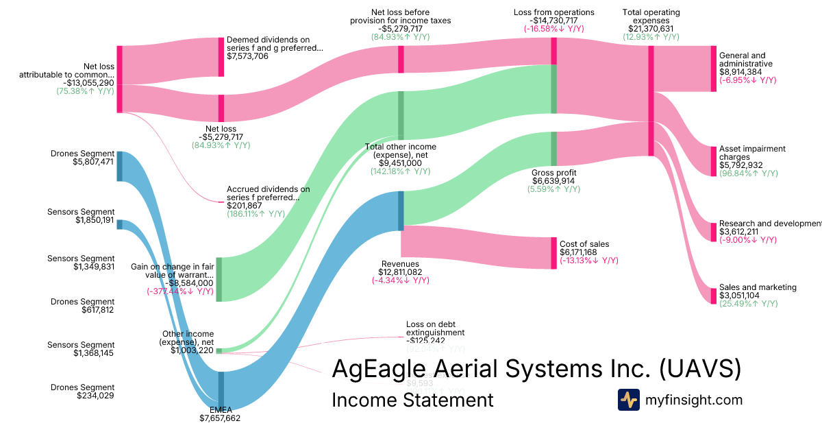 For the year ending 2025-12-31, UAVS made $12,811,082 in revenue. -$13,055,290 in net income. Net profit margin of -101.91%.