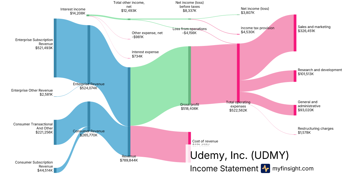 For the year ending 2025-12-31, UDMY made $789,844K in revenue. $3,807K in net income. Net profit margin of 0.48%.