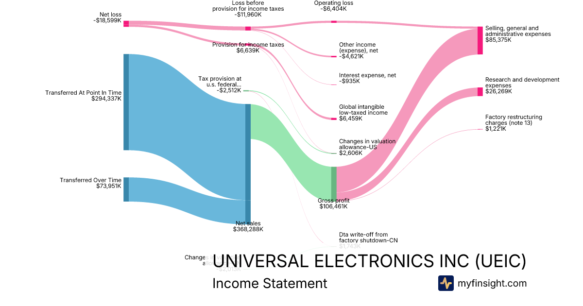 For the year ending 2025-12-31, UEIC made $368,288K in revenue. -$18,599K in net income. Net profit margin of -5.05%.
