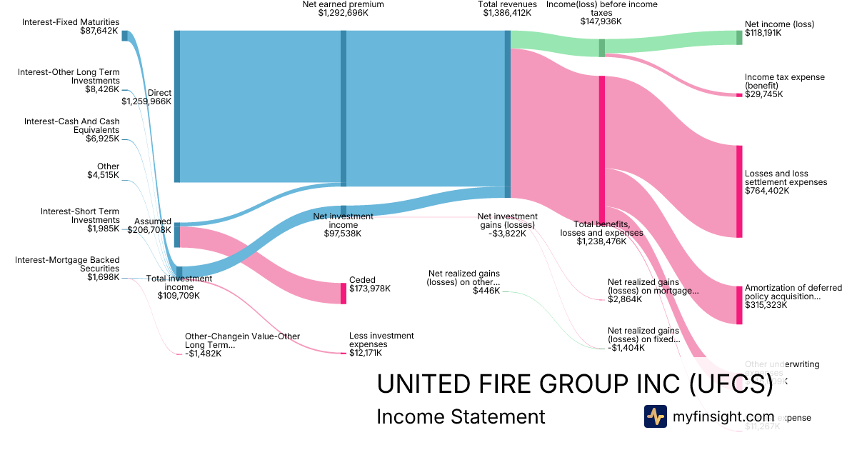 For the year ending 2025-12-31, UFCS made $1,386,412K in revenue. $118,191K in net income. Net profit margin of 8.52%.
