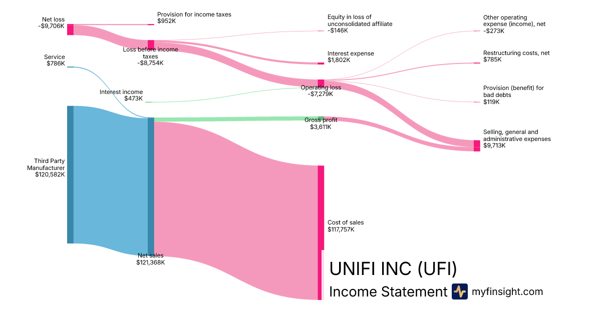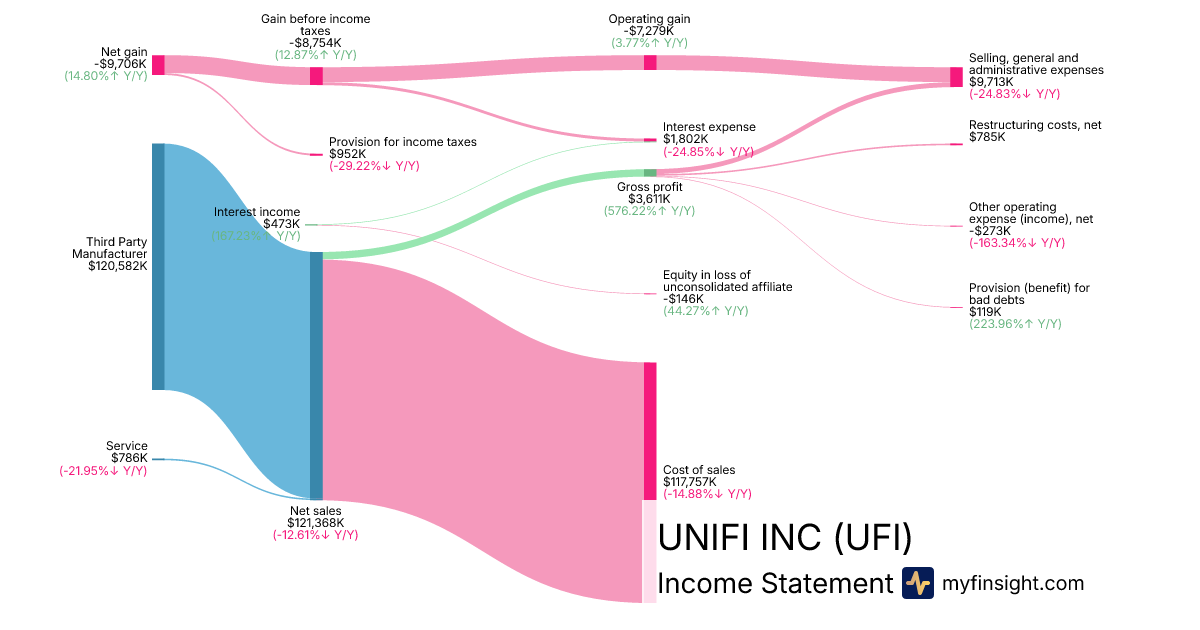 For the quarter ending 2025-12-28, UFI made $121,368K in revenue. -$9,706K in net income. Net profit margin of -8.00%.